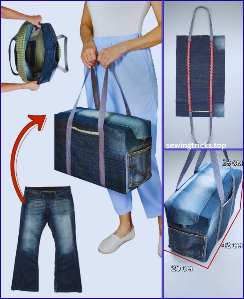 Congratulations! You have successfully created a sturdy and unique travel duffel bag from old jeans.