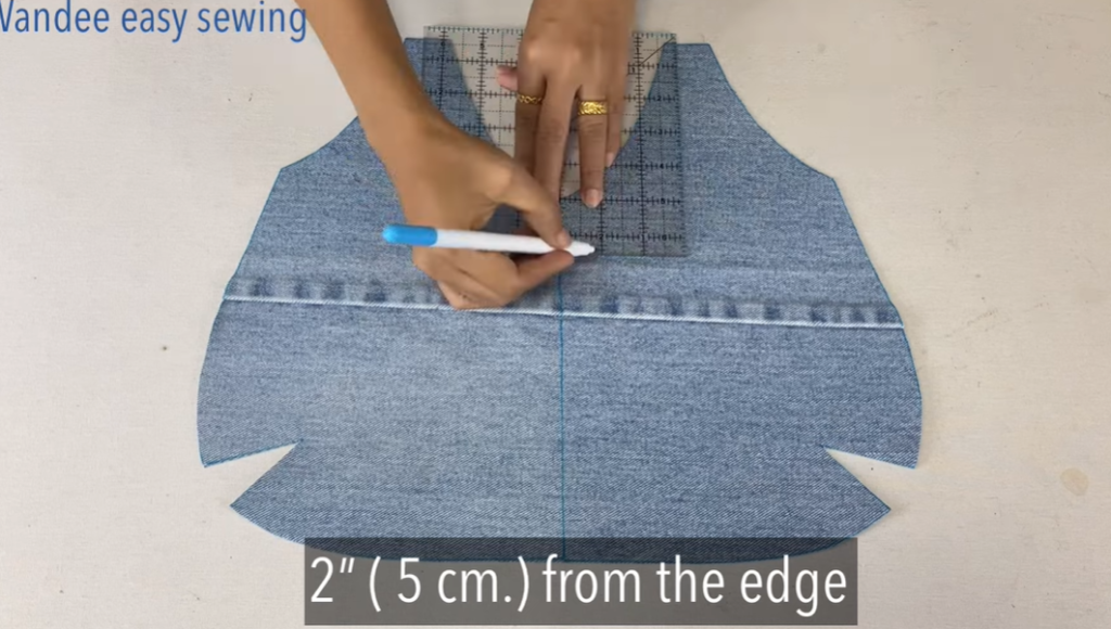 - Cut 2 denim strips: 22–26″ long × 3″ wide